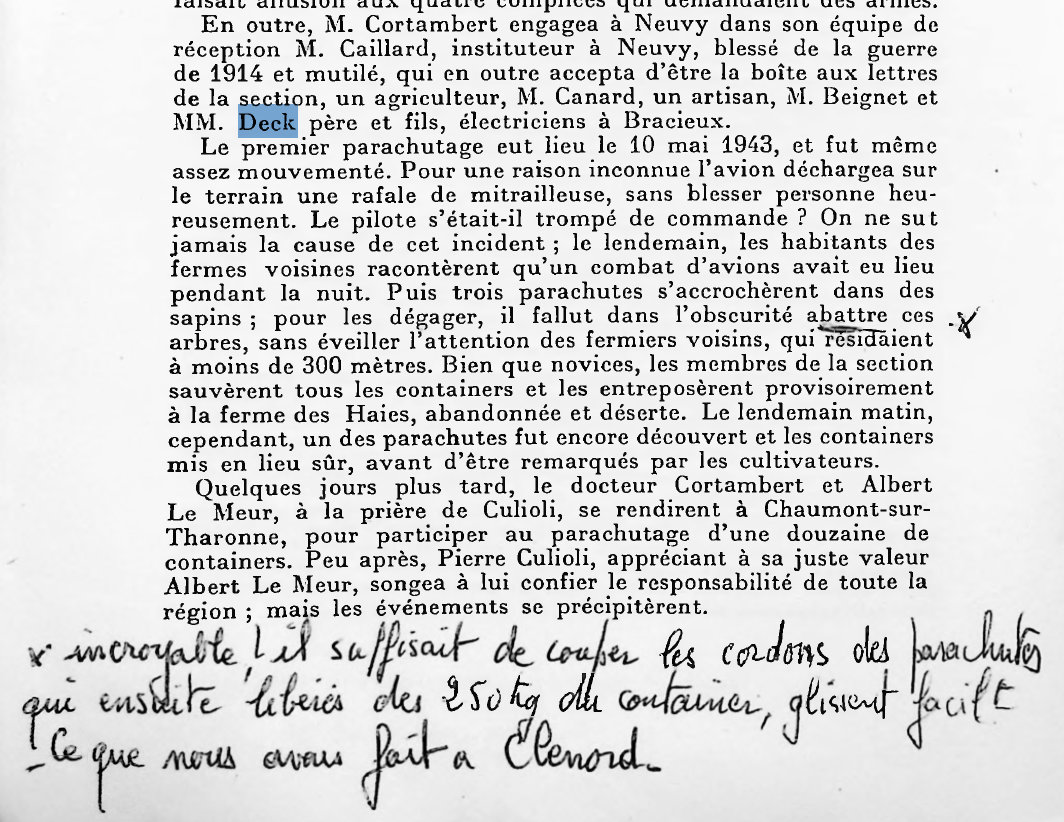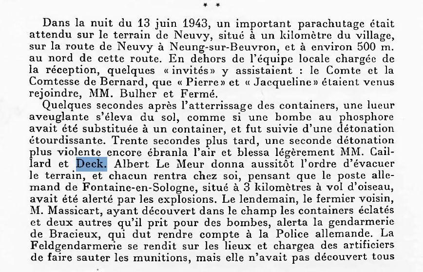 Lors de la nuit tragique du 13 juin 1943 près de Neuvy, Jean Deck et son père sont présents sur le terrain quand 2 containers explosent en touchant le sol. À la suite de cet évènement, le réseau subira de nombreuses arrestations par la Gestapo. Ce 13 juin, sont également sur le terrain : le comte et la comtesse de Bernard, Cullioli « Pierre » et Yvonne Rudelat « Jacqueline » l’agent du S.O.E. Britannique, Marcel Bühler, futur maire de Blois, Mr Ferme, Marius Gaillard, Albert Le Meur et Marcel Montprofit.