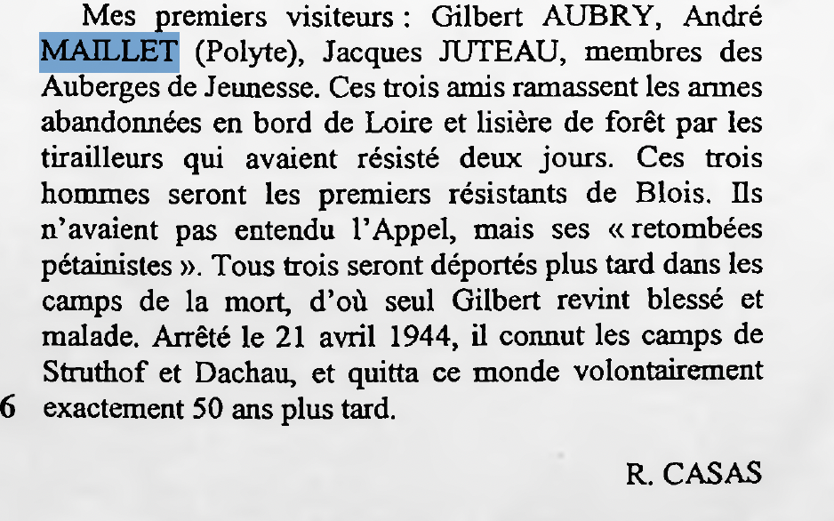 André Maillet, dit « Polyte », est né le 3 février 1922 à Jardres dans le département de la Vienne (86). En 1942, André est apprenti à l’école d’apprentissage d’Air-Equipement ou il côtoie Bernard Mazille et Raymond Casas. Son frère Robert est aussi apprenti électricien dans cette usine blésoise. Organisateur et responsable aux auberges de jeunesse et ayant le contact avec le réseau du « Musée de l’Homme », André Maillet compte parmi les premiers résistants blésois, en ramassant des armes abandonnées aux bords de Loire, et en diffusant des tracts autour de la gare de Blois. Il anime le réseau France Liberté.