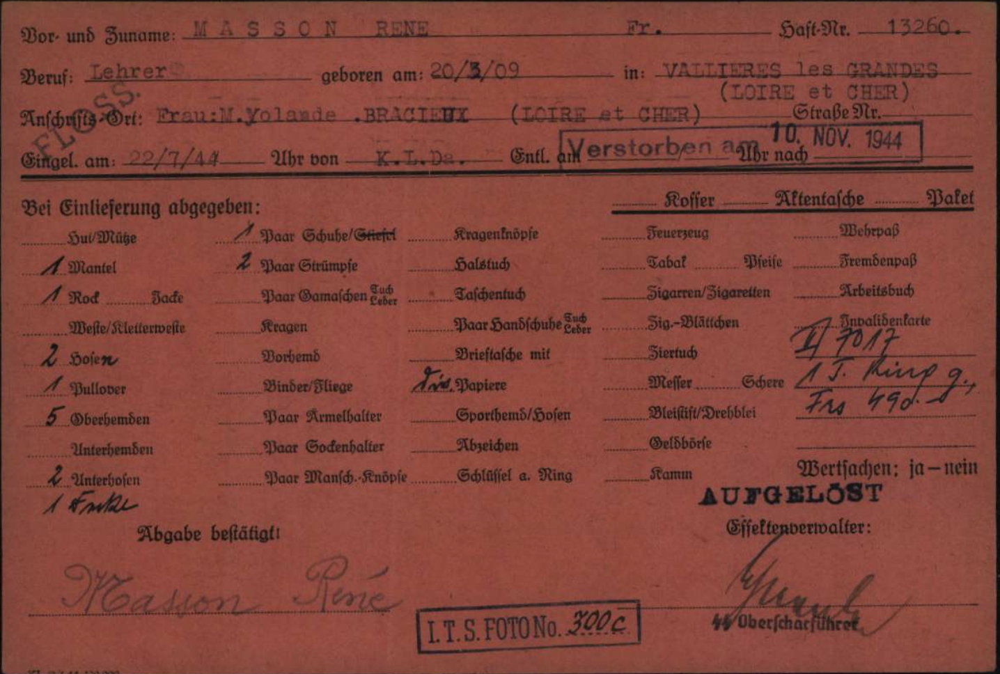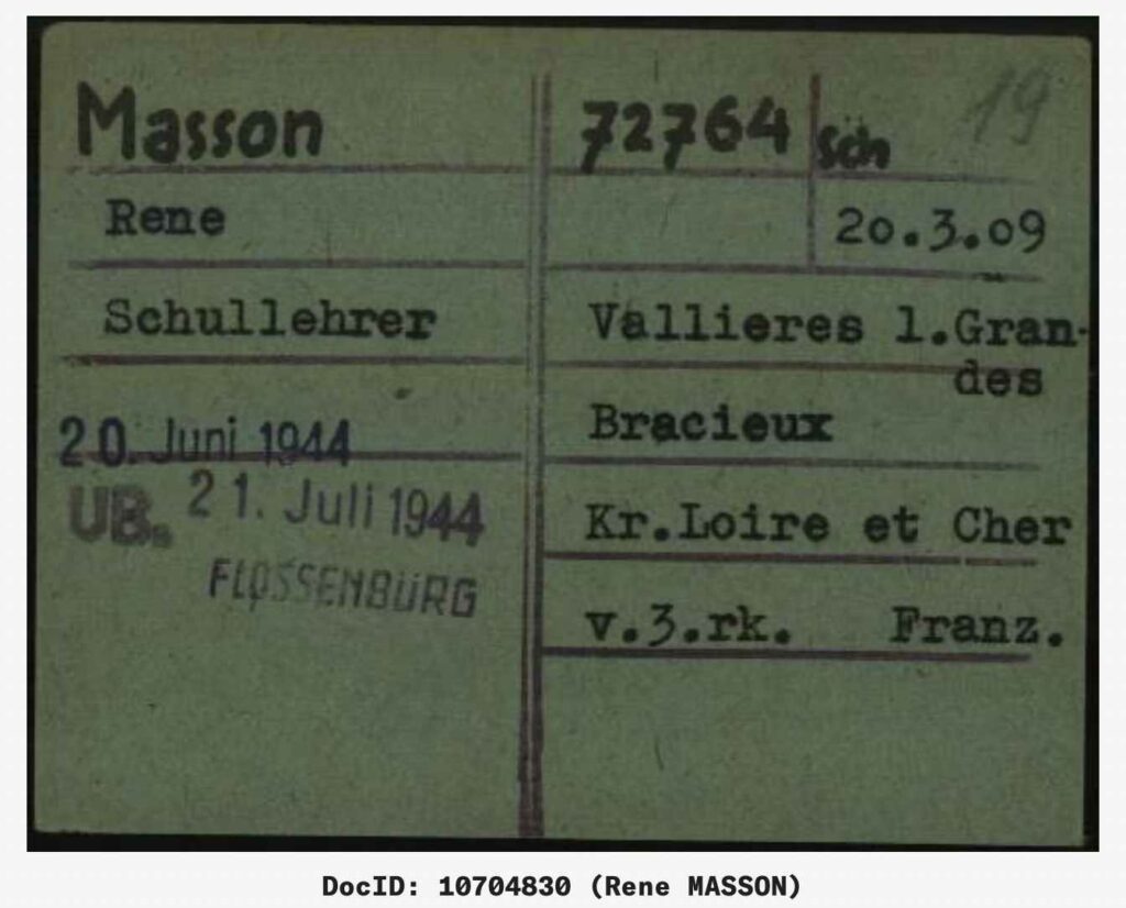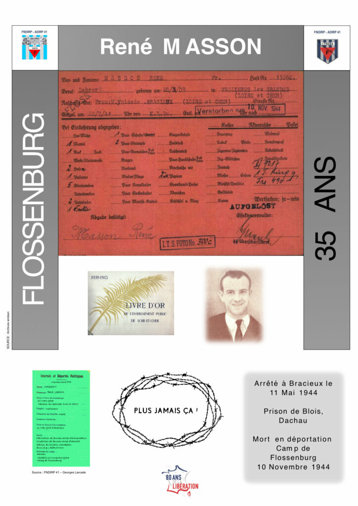 Le 11 mai 1944, René Masson est arrêté par la Gestapo, à la suite d’une dénonciation. Sa femme, Yolande, est également arrêtée le lendemain. Incarcéré à la prison de Blois, puis à celle d’Orléans, René est déporté par le convoi du 18 juin 1944 au départ de Compiègne à destination de Dachau où il est enregistré sous le matricule 72764, et, transféré le 21 juillet à Flossenbürg, puis, affecté au kommando de travail d’Hersbrück (usine souterraine fabriquant des moteurs d’avion). Soumis aux terribles conditions des camps de concentration, il meurt d’inanition et de dysenterie le 10 novembre 1944.