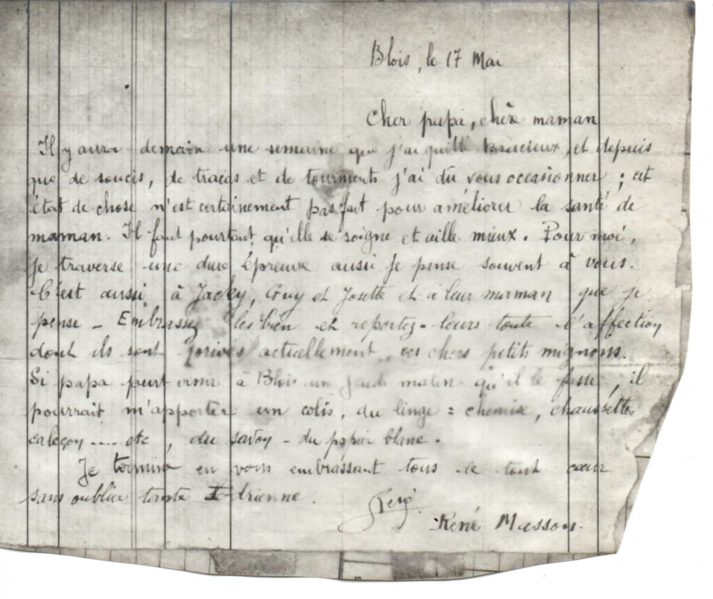 René Masson est né le 20 mars 1909 à Vallières-les-Grandes (Loir-et-Cher), au sein d’une famille modeste : son père était charron et sa mère couturière. Elle décède brutalement le 12 février 1917, privant René dès l’âge de huit ans de de son affection. Élève brillant, René fait ses études à l’École primaire supérieure d’Onzain, et intègre ensuite l’École Normale d’Instituteurs de Blois en septembre 1927, où il se forme pour devenir instituteur. Sa carrière commence à Saint-Amand-de-Vendôme, puis à Pray, au retour de son service militaire.