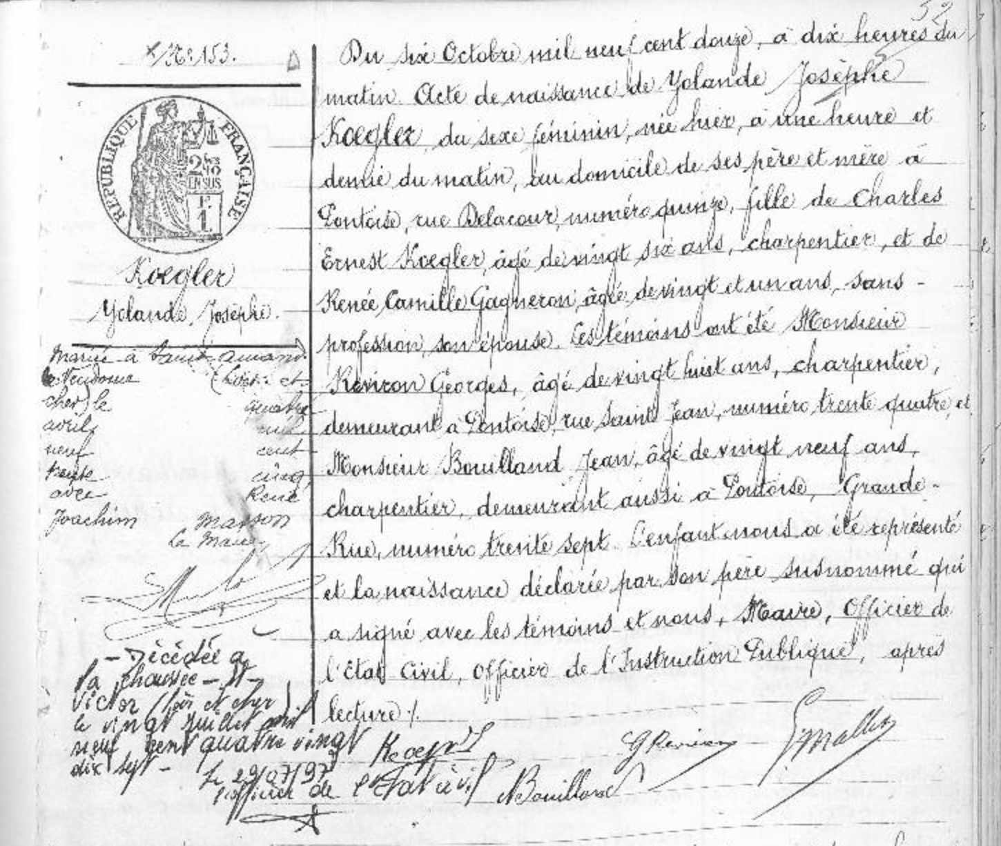 Yolande Josèphe Koegler, épouse Masson, est née le 5 octobre 1912 à Pontoise, dans le département de Seine-et-Oise (et aujourd’hui dans le Val d’Oise). Fille de Charles Ernest Koegler, charpentier, et de Renée Camille Gagneron, sans profession, elle grandit à Monteaux, dans le Loir-et-Cher, où elle est distinguée comme une élève studieuse à l’école de filles. En avril 1925, elle est récompensée par la société des cycles Peugeot pour ses efforts scolaires et gagne un vélo.