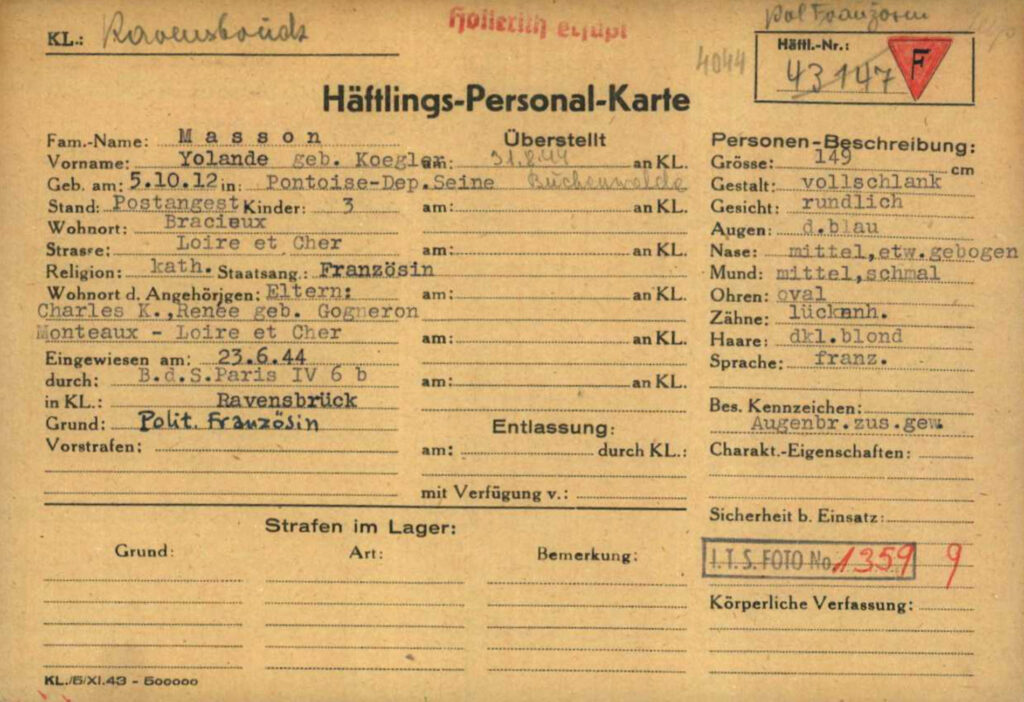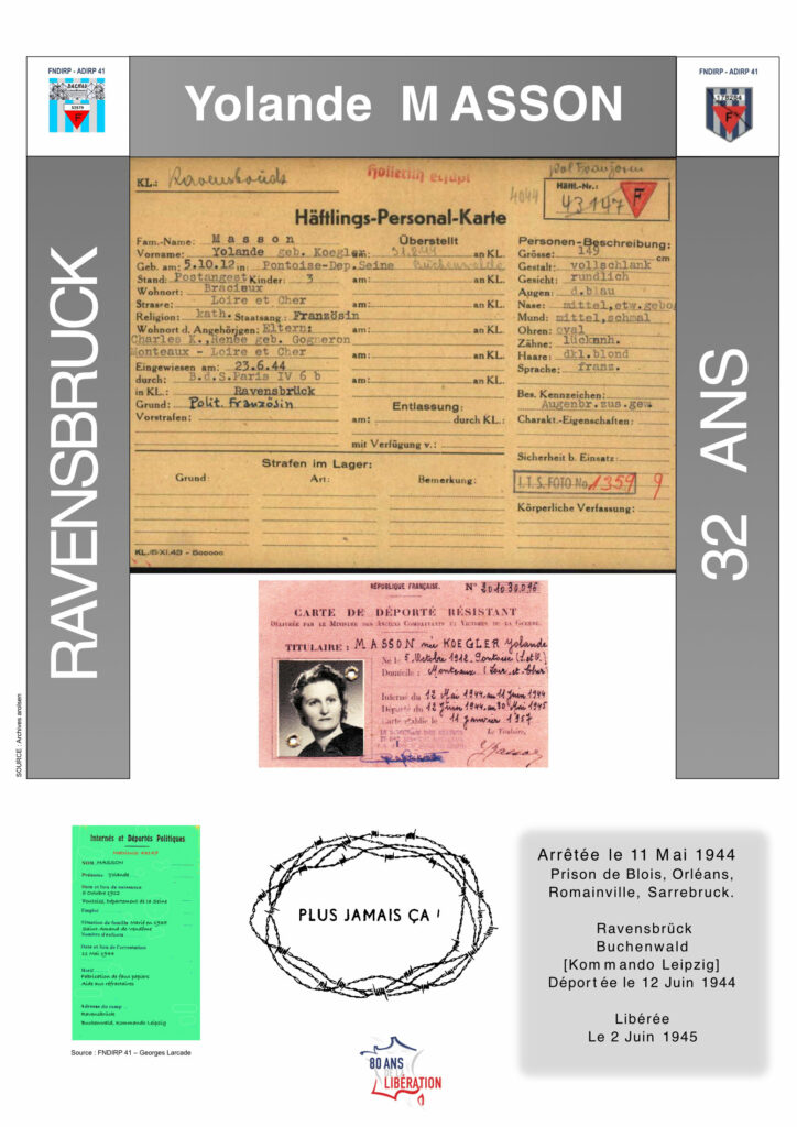 Pendant la Seconde Guerre mondiale, Yolande Masson employée des Postes à Bracieux, s’engage dans la Résistance avec son mari René, notamment en fabriquant des faux papiers, de faux certificats de travail et de fausses pièces d’identité pour les résistants et leur fournissant des tickets d’alimentation. Par ses fonctions comme employée aux PTT (Postes, Télégraphes, Téléphones), Yolande intercepte du courrier qui est adressé à la Kommandantur et fournit les renseignements à la Résistance sur son contenu. Par suite d’une dénonciation, elle est arrêtée un jour après son mari, le 12 mai 1944. Elle est emprisonnée successivement à Blois, Orléans et Compiègne avant d’être déportée le 12 juin 1944. Partie de la gare de l’Est à Paris avec 63 autres femmes, elle arrive au camp de Neue Bremm à Sarrebruck, puis est transférée le 23 juin 1944 au camp de concentration de Ravensbrück où elle est enregistrée sous le matricule N°43147. Le 31 août 1944, elle est envoyée au camp de Buchenwald et affectée au kommando Leipzig.