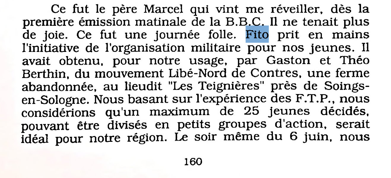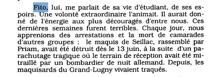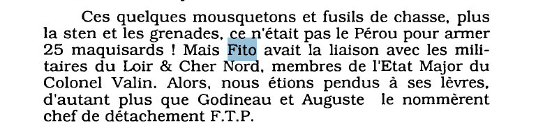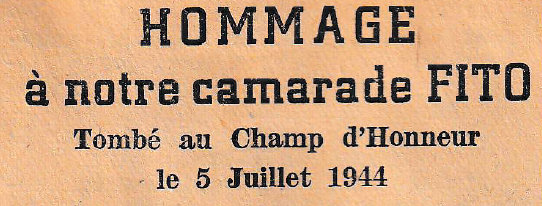 Fito est mort le 5 juillet 1944 dans une embuscade allemande à Saint-Gervais-la-Forêt. Cet événement a profondément marqué ses camarades et la résistance locale. ​ Après la guerre, son sacrifice a été honoré de plusieurs manières : une salle de soins dans un hôpital F.F.I. à Blois a été nommée en son hommage. Un groupe de résistants a également porté son nom, témoignant de l’importance de son rôle et de l’estime qu’il inspirait. Fito reste une figure de la résistance, symbolisant le courage et le sacrifice dans la lutte contre l’occupation nazie.