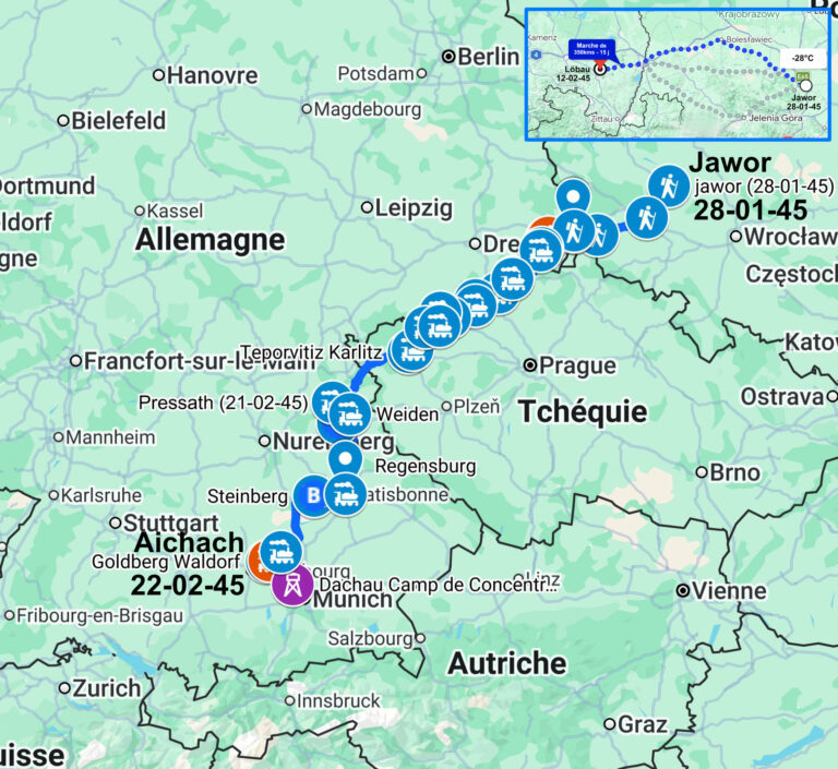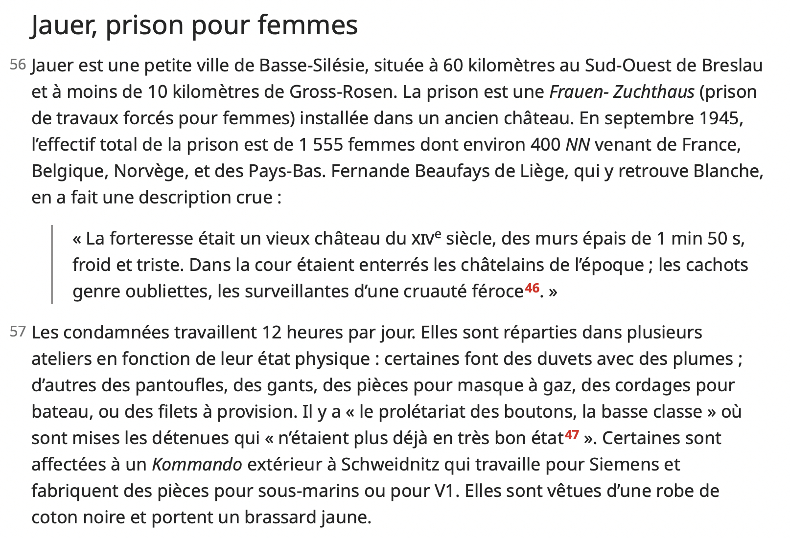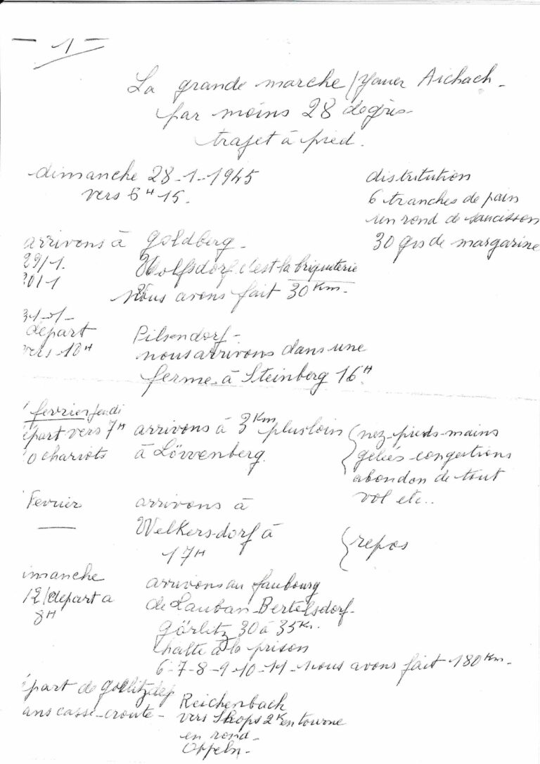 Incarcérée le 15 février 1942 jusqu’au 15 mars 1942 à Blois, puis transférée à Orléans jusqu’au 30 avril 1942 avant de séjourner au centre pénitentiaire de Paris-La Santé du 1er mai 1942 au 20 mai 1942, date à laquelle elle partira pour Aachen (Aix-la-Chapelle). Condamnée à 8 ans de travaux forcés le 15 septembre 1942, Micheline fut ensuite détenu au pénitencier de Lubek du 21 septembre 1942 à mai 1944, et ce sera la forteresse de Jauer [Jawor] (prés de Breslau), la monstrueuse prison pour femmes, de mai 1944 au 28 janvier 1945. Devant l’avancée des troupes soviétiques, le 29 janvier 1945, elle quitta la forteresse avec 113 camarades prisonnières dont 93 françaises, en marche forcée par des températures négatives atteignant parfois -28°C sur un parcours d’environ 350 kms à pied. Son arrivée à Aichach (Bavière) est datée au 21 février 1945 avec une libération le 29 avril 1945.