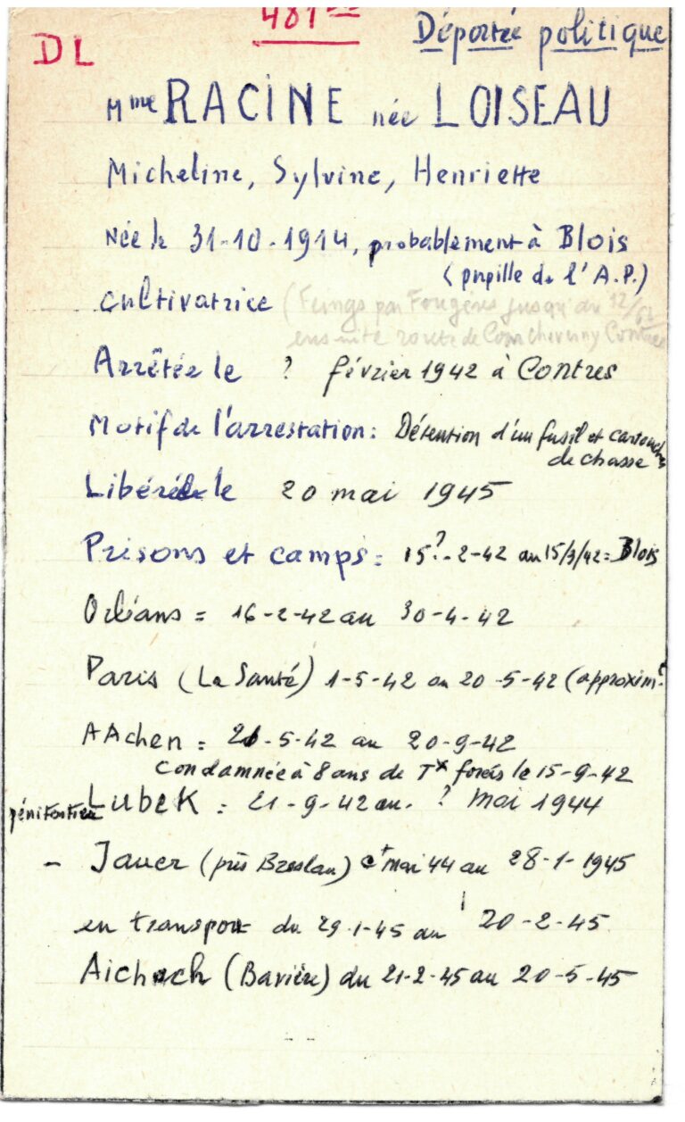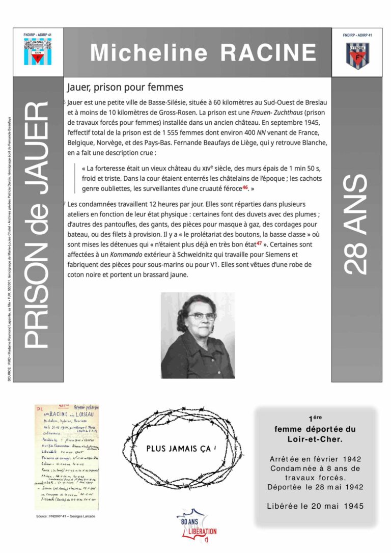 Micheline, Sylvine, Henriette Loiseau, épouse Racine est née le 31 octobre 1914 à Blois. Elle est pupille de la nation tout comme son mari Noël né le 25 décembre 1909. Ils se marient le 25 novembre 1932 à Feings. Elle exerçait le métier de cultivatrice. Lors de son arrestation en février 1942, son fils ainé Gilbert né à Contres le 13 mars 1935 avait 7ans, sa cadette née à Contres le 13 mai 1937avait 5 ans et le benjamin Guy né le 20 février 1939 avait 3 ans, son mari était prisonnier en Allemagne.