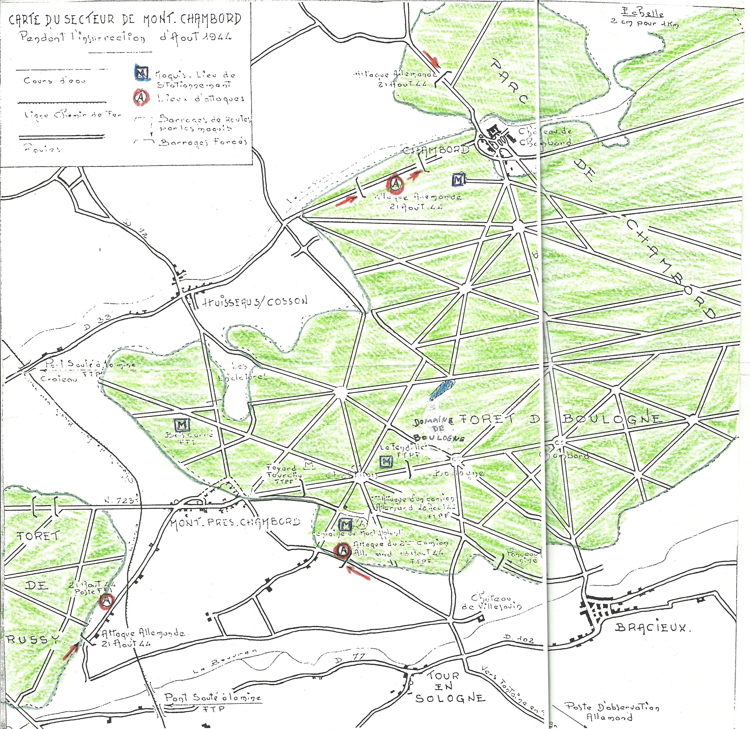Les combats du 21 Août 1944 à Chambord Plaque de 1946. Plaque modifiée par le Président François Mitterand. LIVRE DE LUCIEN JARDEL & RAYMOND CASAS RÉCITS PERSONNELS DE RAYMOND CASAS SUR SON COMBAT LE 21 AOÛT 1944 TÉMOIGNAGE de Mr le Chanoine J. GILG, Curé de Chambord (1944). et commentaires de Raymond Casas EXTRAIT CONCERNANT LES COMBATS DE CHAMBORD DU 21 AOUT 1944 - Paul Guillaume Adolphe Brana. Rescapé du Massacre du 21 août 1944. - Photographié en 1963. Carte du secteur Chambord / Huisseau / Mont Source: Musée de la Résistance, de la Déportation et de la Libération du Loir-et-Cher. Le crash du 22 juin 1944 Debout, au centre, le pilote William KALAN, à sa droite, le co-pilote Kenneth KLEMSTINE. Plaque commémorative - Ecole de Montlivault